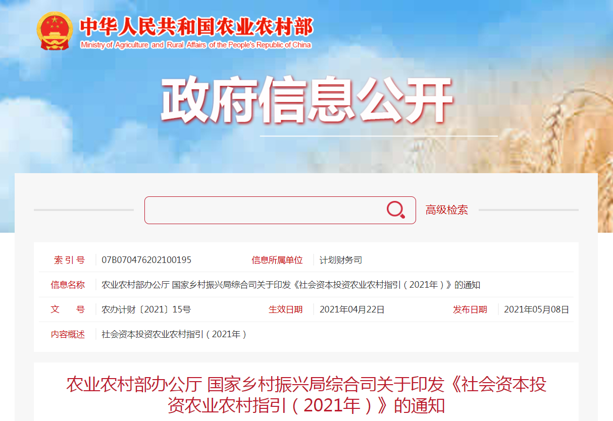 社會資本投資農(nóng)業(yè)農(nóng)村指引(2021年)