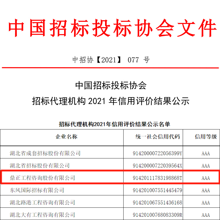 近日,中國招標投標協會頒布了招標代理機構2021年信用評價結果公示,鼎正工程咨詢股份有限公司繼獲得2021年度工程造價咨詢企業AAA信用評級后,再榮獲招標代理機構AAA信用評級!