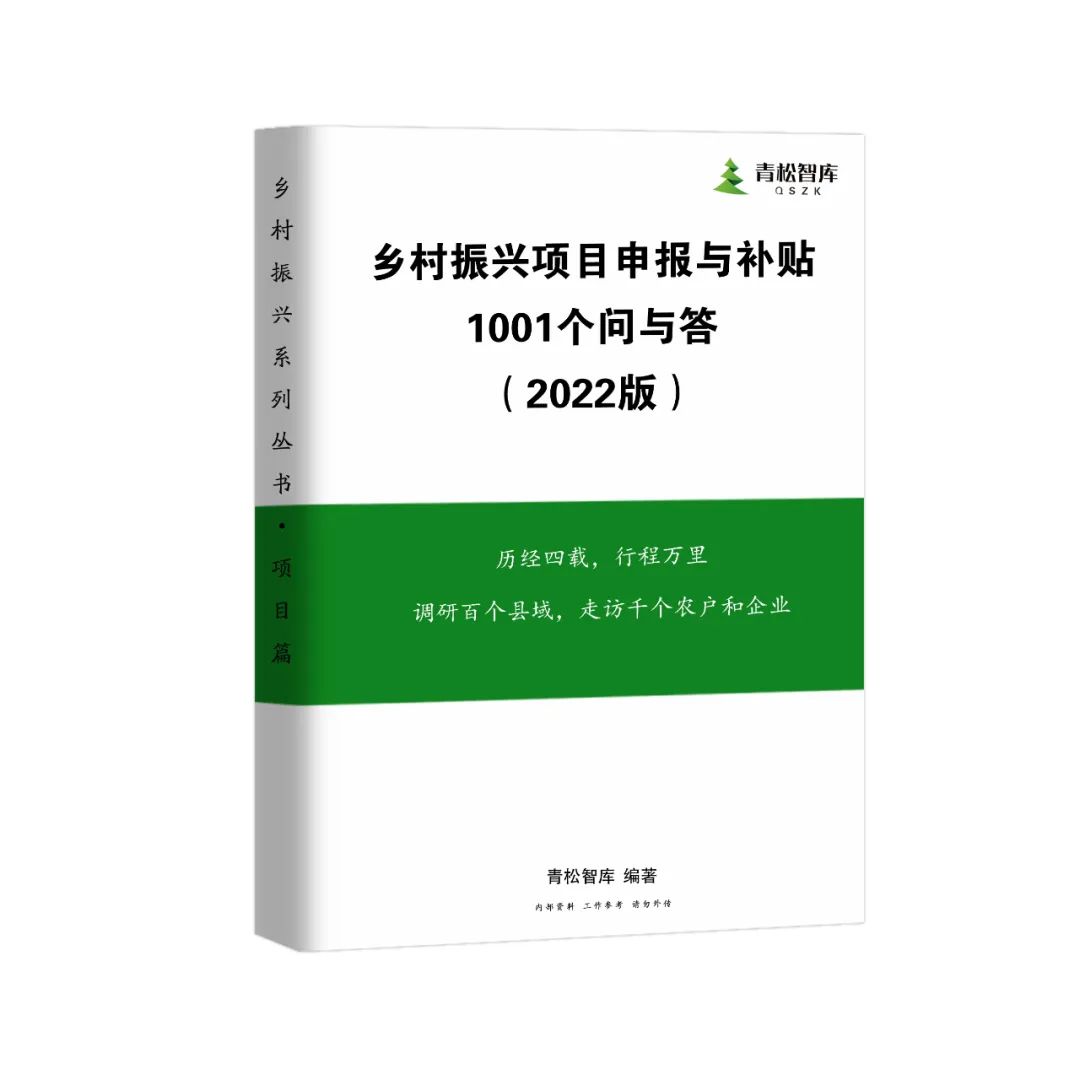 歷經四載,行程萬里,調研百個縣域,走訪千家農戶(或企業),凝聚匠心,由青松智庫編制的《鄉村振興項目申報與補貼1001個問與答》內部資料,數量有限,是常用工作參考工具書,有需要的請加緊與青松智庫聯系。
