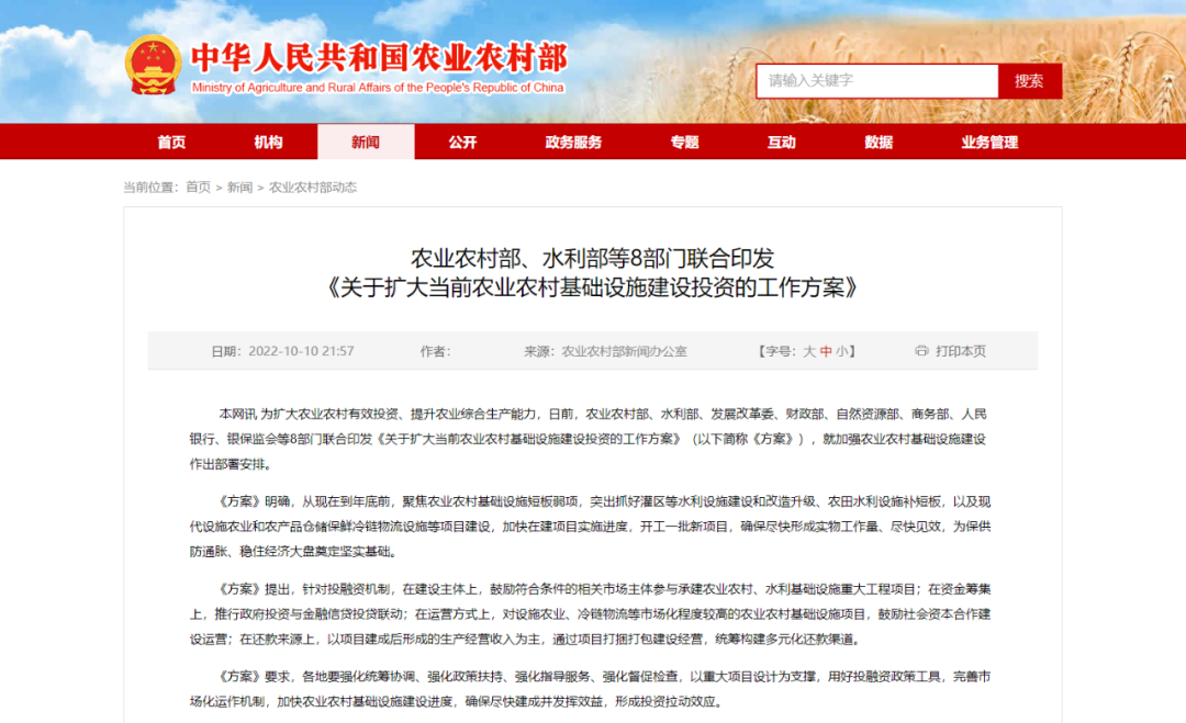 《關于擴大當前農業農村基礎設施建設投資的工作方案》