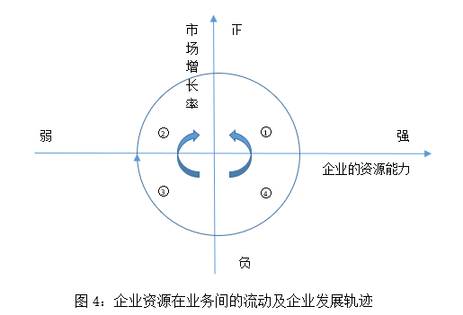 業(yè)務(wù)開(kāi)始都是企業(yè)資源能力較弱,市場(chǎng)增長(zhǎng)率很強(qiáng),企業(yè)會(huì)注入資源;然后業(yè)務(wù)的企業(yè)能力變強(qiáng),市場(chǎng)增長(zhǎng)率會(huì)很高,企業(yè)繼續(xù)投入資源。但過(guò)了高增長(zhǎng)期之后,該業(yè)務(wù)的增長(zhǎng)率會(huì)降低,降低的原因是由于市場(chǎng)競(jìng)爭(zhēng)者增多導(dǎo)致的。如果企業(yè)處于比較劣勢(shì)的地位,那么業(yè)務(wù)就會(huì)處于負(fù)增長(zhǎng),企業(yè)就應(yīng)從中抽取資源投入有潛力或增長(zhǎng)趨勢(shì)正強(qiáng)勁的業(yè)務(wù)。該業(yè)務(wù)的企業(yè)能力隨著資源的逐漸減少,業(yè)務(wù)能力弱化,企業(yè)進(jìn)入第三象限,直至該業(yè)務(wù)消亡。