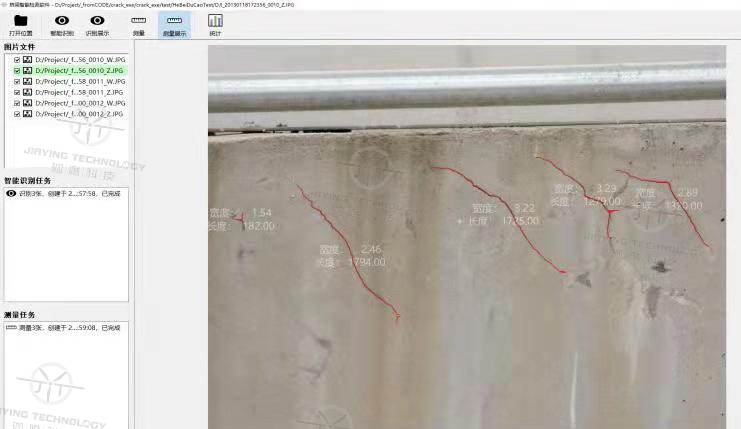 對(duì)于斜拉索橋,其受力模式較為復(fù)雜,多個(gè)關(guān)鍵部位均有可能產(chǎn)生受力裂縫或其他病害。珈鷹利用自主研發(fā)的智能識(shí)別測(cè)量軟件對(duì)已采集的高清圖像進(jìn)行智能、高效處理,精準(zhǔn)定位受損位置,捕捉病害。