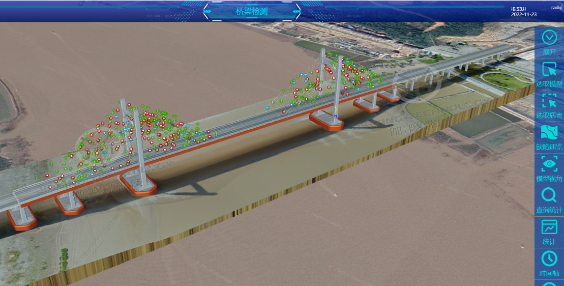 根據(jù)拍攝的高清圖像重建橋梁三維模型,并定量標(biāo)示各類缺陷的位置,并且搭建獨(dú)立的大數(shù)據(jù)云平臺(tái),實(shí)現(xiàn)橋梁缺陷與病害的可視化,對(duì)橋梁?jiǎn)栴}進(jìn)行三維立體化復(fù)現(xiàn),為橋梁安全運(yùn)行提供數(shù)據(jù)支撐。