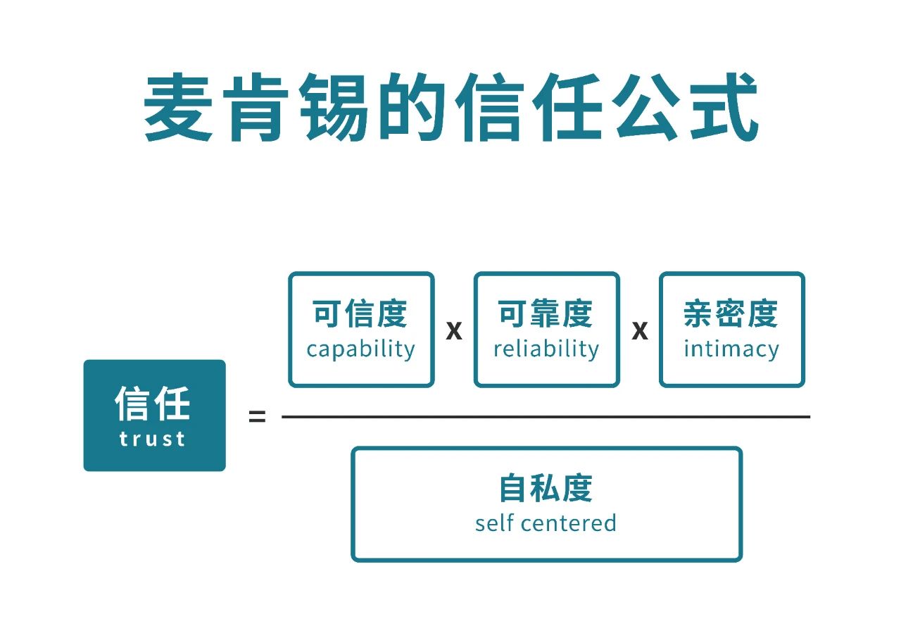 麥肯錫信任公式為我們對(duì)信任度進(jìn)行量化評(píng)估提供了指導(dǎo)框架。根據(jù)影響信任的4個(gè)因素,我們了解到,信任是藏在尋常日子里的點(diǎn)滴小事,也是在一件又一件的小事情中積累起來(lái)的一種相互關(guān)系。