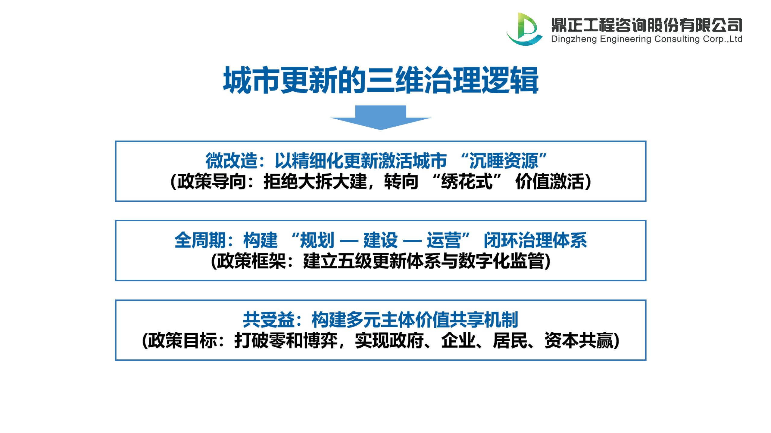 (三)共受益:價(jià)值共享機(jī)制 《意見(jiàn)》強(qiáng)調(diào)“共建共治共享”,通過(guò)角色轉(zhuǎn)型、利益分配創(chuàng)新與溝通機(jī)制,讓各參與方成為價(jià)值創(chuàng)造的主角。“共受益”旨在構(gòu)建政府、企業(yè)、居民、資本多元主體共贏機(jī)制,通過(guò)角色分工、關(guān)鍵機(jī)制創(chuàng)新,破解訴求沖突,實(shí)現(xiàn)協(xié)同增效,讓城市更新成果惠及全體人民,推動(dòng)從“利益博弈”到“價(jià)值共創(chuàng)”的轉(zhuǎn)變。