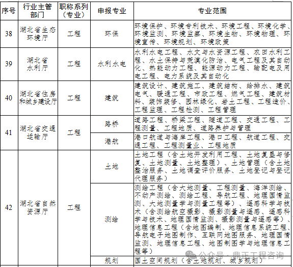 鄂職改辦已下發(fā)《湖北省職稱評審專業(yè)目錄》(鄂職改辦〔2021〕46號),其中工程系列已涵蓋環(huán)保、水利水電、建筑、土地、測繪、規(guī)劃等相關(guān)專業(yè),詳見下圖: