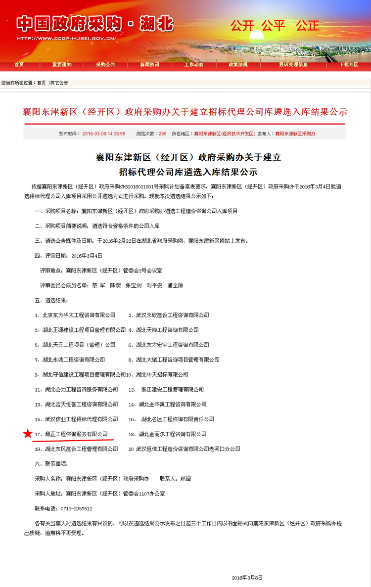 【經(jīng)營(yíng)成果】我司入圍襄陽(yáng)東津新區(qū)(經(jīng)開區(qū))政府采購(gòu)辦招標(biāo)代理公司庫(kù)