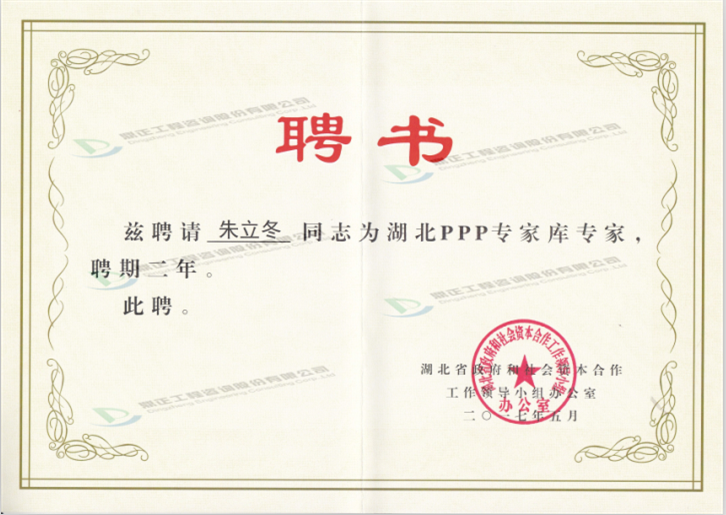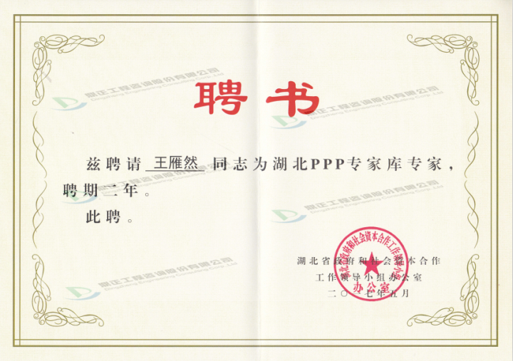 近日,湖北省政府和社會資本合作工作領導小組辦公室授予鼎正公司董事長王雁然先生、副總經(jīng)理兼技術總監(jiān)朱立冬教授為湖北省PPP專家?guī)鞂<摇4饲?/SPAN>